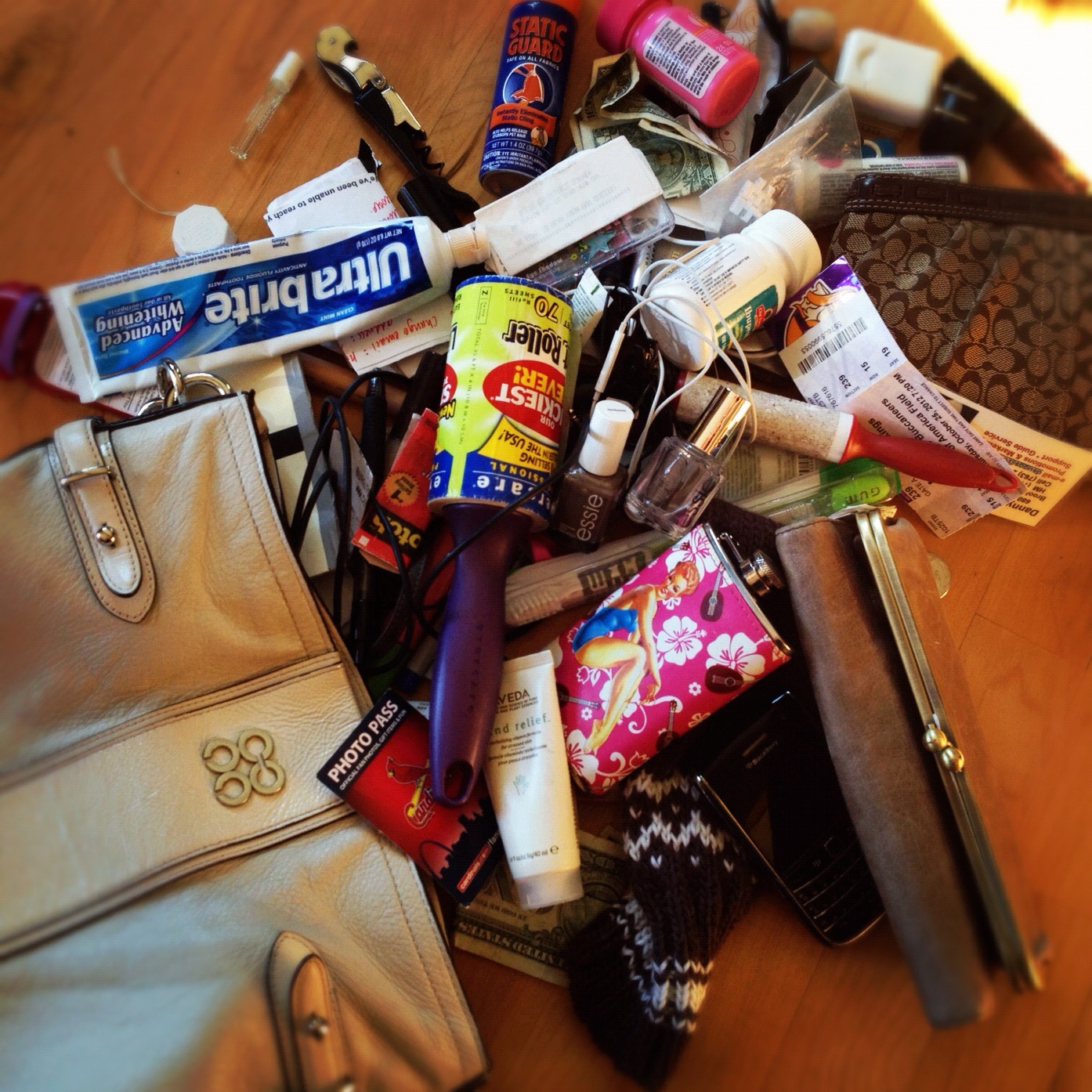 Like many women and more specifically – moms – I carry a bag. Sometimes men call this a purse. I don’t like that word. Anyway, I consider this bag to be conservative in size. I mean, first of all, it is not on wheels. And it fits under the seat of an airplane. And I have to haul around a lot of stuff because I’m a full-time working mama of two little divas.